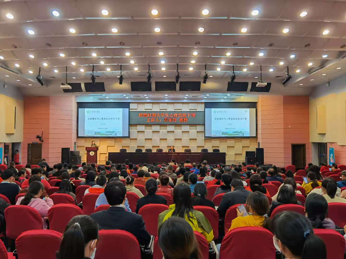 为了进一步贯彻落实《广东省教育厅关于切实加强2020年秋季学期高校学生心理危机预防与干预工作的通知》的文件精神,提升永利官网师生心理健康教育水平,提高教职员工对大学生心理问题的认知能力和干预技能。12月8日,学校在学术报告厅举行了“大学生心理危机干预”专题培训讲座。邀请了教育部高校辅导员培训与研修基地首席专家、广东省教育厅突发事件应急管理心理专家、广东省高校心理健康教育与咨询专业委员会副主任、东莞理工学院苏亚玲教授作了专题辅导报告。各二级学院党总支书记、辅导员、班主任、学校舍务管理人员以及学生工作部有关人员近300人共同聆听了讲座。讲座由学生工作部部长陈春艳主持。