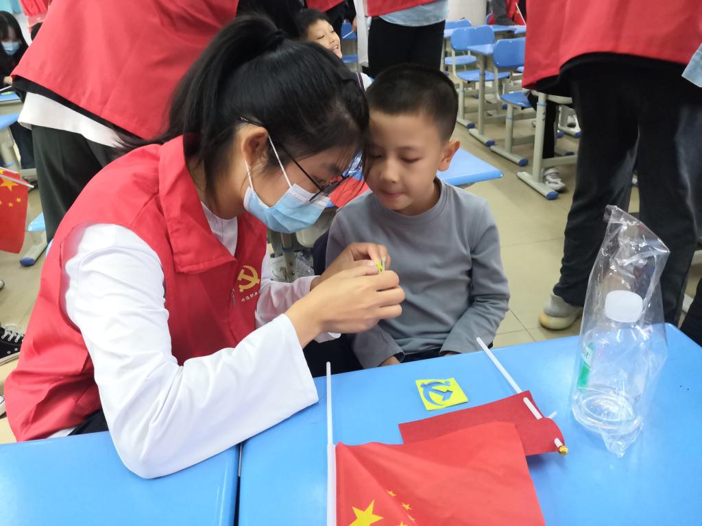活动期间,在逢沙义教团队的带领下,在教室内外有序展开了互动游戏,让气氛活跃了起来。紧接着由张老师对党旗制作进行了讲解:“一面红旗上,加上一把镰刀一把斧头,这是我们的党旗。锤子、镰刀代表工人和农民的劳动工具,象征着中国共产党是中国工人阶级的先锋队,代表着工人阶级和广大人民群众的根本利益。”孩子们在老师的指导下制作着党旗,他们用稚嫩的小手在无纺布上画着、剪着、粘着……一面面鲜红的党旗诠释着孩子们对党旗的崇敬之意。在制作过程中让孩子们充分了解党徽、党旗的含义,教育引导孩子感恩党、感恩祖国,使得小学生、家长及志愿者在欢声笑语之后,更深思党旗背后的含义。感恩在党的带领下,所取得的成就,以及所拥有的幸福生活。制作结束后,小朋友拿着制作好的党旗,纷纷表达自己对党对祖国的美好愿望以及自己的梦想。