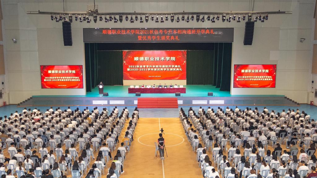 10月29日晚,永利官网2021秋自学考试专升本相沟通班开学典礼暨2020-2021学年度优秀学生颁奖典礼在梁銶琚礼堂举行,华南师范大学继续教育学院副院长梁晓庆,广东技术师范大学继续教育学院院长刘文刚、机电学院院长杨勇,永利官网副校长罗丹、酒店与旅游管理学院副院长陈宝珠、商学院副院长李明,永利官网继续教育学院院长王法勇、副院长周钦青,继续教育学院相关老师以及2021秋自考专升本相沟通班600多名新生参加。典礼由王法勇主持。