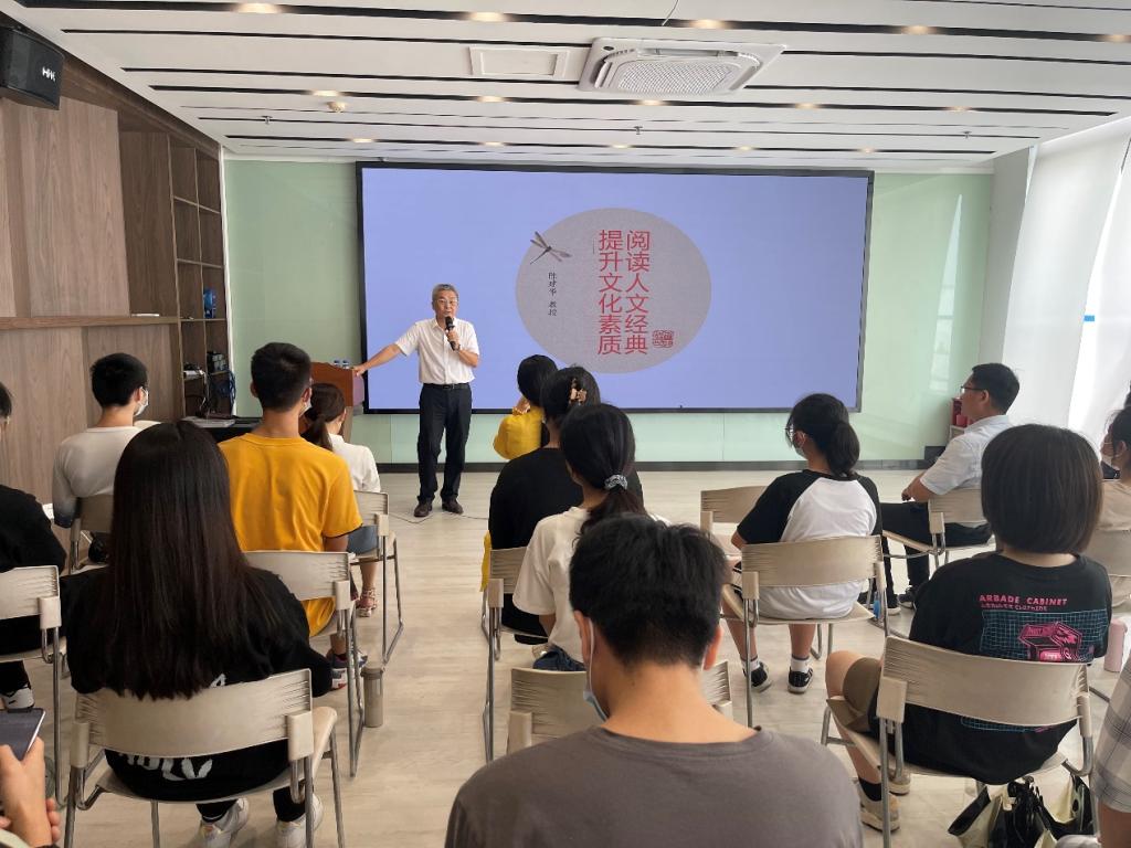 分享会上,陈建华教授用亲身经历引出分享主题,围绕“什么是经典”“为什么要学习经典”“经典学习与文化素质提升”“中华诗词经典作品选讲”四部分内容与师生们展开对话。他用大量古今中外著作、名人名言阐述阅读人文经典与提升文化素质的关系,认为经典是一种修身文学,读经典能“括根本,益身心”,能培养品德,领悟人生哲理,大有裨益。“当代青年必须多读经典,因为经典来自于政治的思考,来自修养处世的思考,可以培养思想素质、道德素质、能力素质。”陈建华教授选取张若虚的《春江花月夜》、陈子昂的《登幽州台歌》、杜甫的《旅夜书怀》、李商隐的《无题》、苏轼的《定风波·莫听穿林打叶声》、余光中的《等你,在雨中》等六首经典诗词作深入解读,带领师生共同品读经典诗词的意蕴。