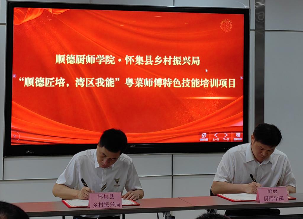 活动现场,烹饪学院与怀集县乡村振兴局签订“顺德匠培湾区我能”粤菜师傅特色技能培训项目协议,双方将共同开展中式烹调师对口劳务协作培训、考证、就业等工作,助力怀集乡村振兴。