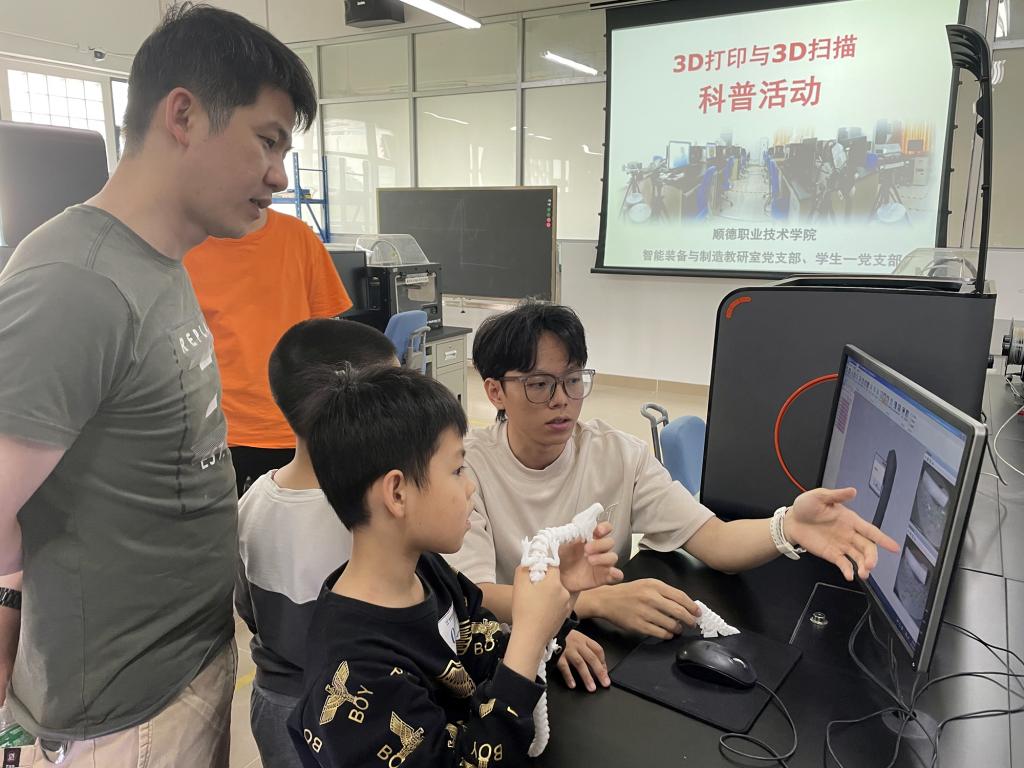 活动中,智能制造学院师生担任科普志愿者,引导顺峰小学学生及家长参观广东-亚琛工业4.0应用研究中心,讲解美的集团数字化转型示范厅、数字化转型应用超市,让孩子们了解智能家居与物联网家电在生活中的运用,激发孩子们爱科学、学科学、用科学的兴趣。随后,学生和家长们参观了3D打印技术体验实训室与工业机器人技术体验实训室,智能装备与制造教研室党支部教师党员讲解实操,手把手教孩子们体验3D打印技术、操作机械手臂、运行物料传送带,培养他们的动手能力和创新思维。