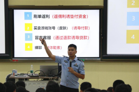 黄兴明围绕如何防范电信网络诈骗及“断卡”专项行动注意要点进行讲解,针对常见电信诈骗类型进行科普,告诫同学们未知链接不点击,陌生来电不轻信,个人信息不透露,转账汇款多核实。