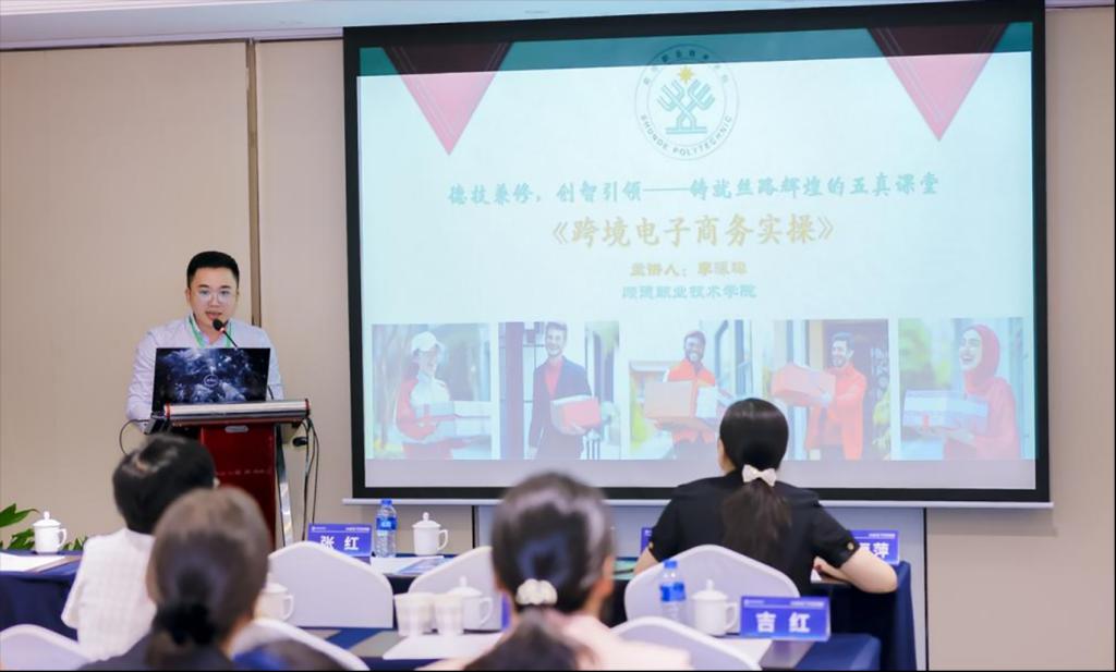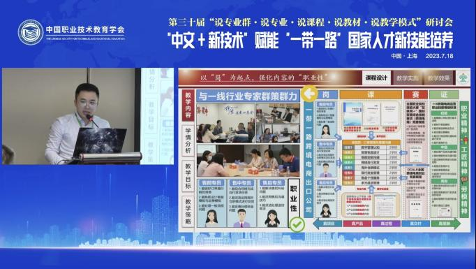 在“说课程”环节,永利官网外语外贸学院教师李泳璋围绕《跨境电子商务实操》课程进行了题为《德技兼修,创智引领——铸就丝路辉煌的五真课堂》的主题分享,阐述了如何构建以“求真”为途径、以“思政”为归宿、以“创业”为主张的丝路电商“五真课堂”,以及外语外贸学院如何借助教学模式创新,培养会语言、通国家、精技术的高水平跨境电商人才。他还分享了永利官网通过国际化平台构建,推动建设服务国家发展战略的高水平职业技术大学的实践经验。