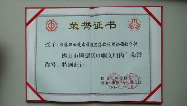 永利官网思政课部现有教职工22名,其中女教职工14名,占职工总人数的63.6%。女教职工中,教授2名,副教授1名,讲师7名,博士1名,硕士13名,逐步形成了一支高学历、高职称的教师队伍。自创建“巾帼文明岗”以来,思政课部在顺德区妇联、区总工会、学校党委和工会的领导下,以“巾帼文明岗“创建工作为契机,为人师表,争当教书育人女标兵;刻苦钻研,争当教学改革女能手;勇于创新,争当课程建设女先锋;潜心研究,争当科研女骨干;勤奋学习,争当读书女模范;爱岗敬业,争当服务奉献女表率;创先争优,争当岗位女楷模。