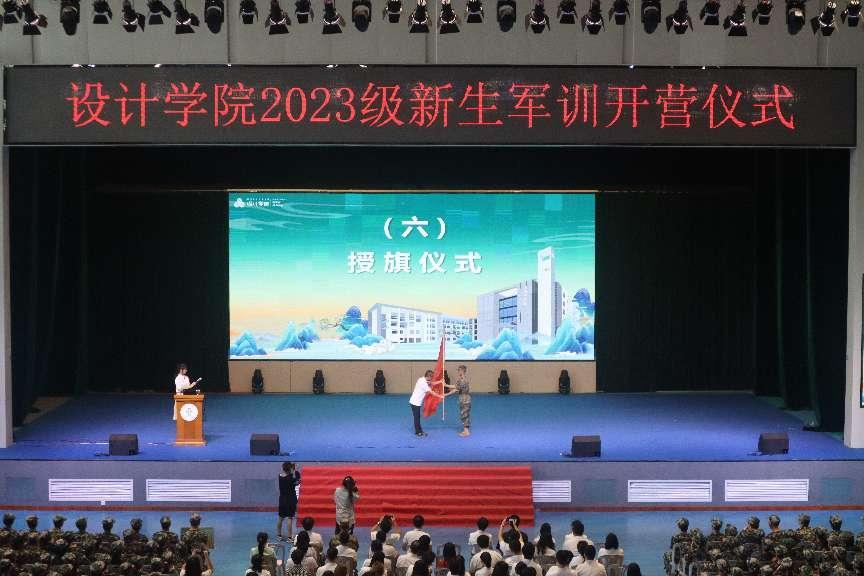 军训开营仪式上,姚美康向教官授军训营旗。设计学院2021级退伍军人陈伟添作为教官代表发言,表示将以良好的军人形象、过硬的军事本领给新生做好榜样。