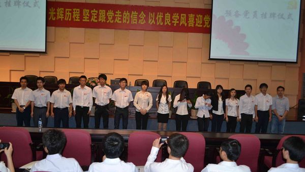 报告会开始前进行了预备党员的授牌仪式,26名新发展的预备党员在庄严的党旗下佩戴起了“我是党员,向我看齐”的党员身份标志牌。