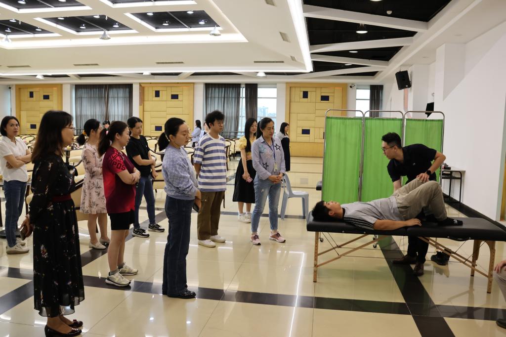 伍文威介绍了最常见的慢性损伤的种类、原因及自我保护的方法,针对常见的颈椎病、腰椎病的预防和治疗进行了专业讲解,向大家传授了简单易学的保健和治疗方法。他建议大家工作时注意姿势保持颈部平直,切勿前引;长时间伏案工作时,要适当起身活动下颈椎以及四肢,切勿长时间保持同一姿势;多做运动,运动前记得“动态热身”、运动后记得“恢复身体肌肉状态(静态拉伸)”,减少颈椎病、腰肌劳损的发病机率。讲座结束后,美瑞医院的四名康复专家现场为教职工进行义诊。