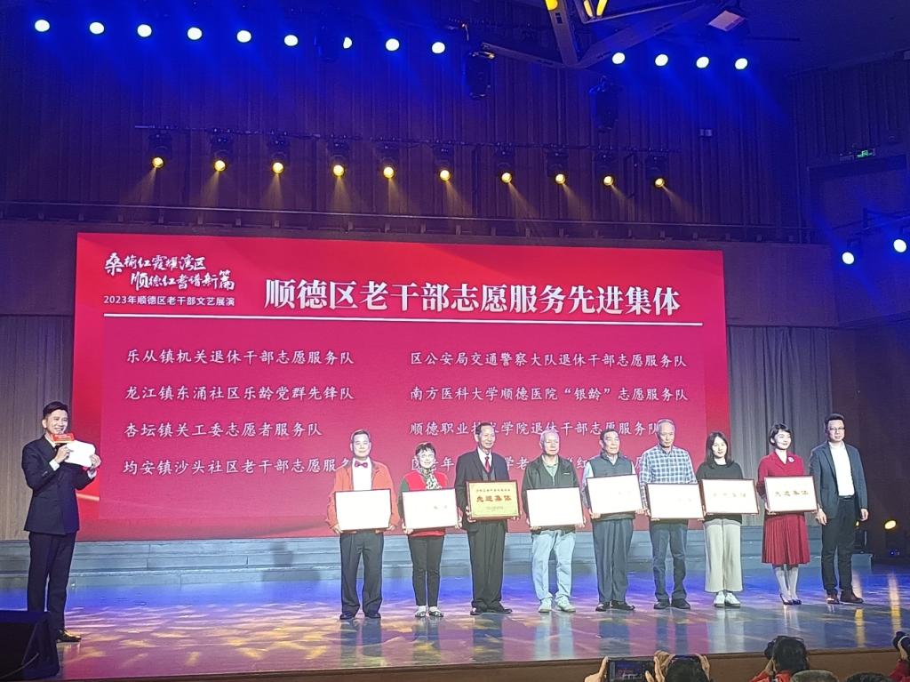 11月16日下午,顺德区委老干部局在顺德区演艺中心举办“桑榆红霞耀湾区,顺德红耆谱新篇”顺德区老干部会议,会上永利官网获区老干部志愿服务先进集体称号,退休老师陈建华、高钧获区老干部志愿服务先进个人称号。