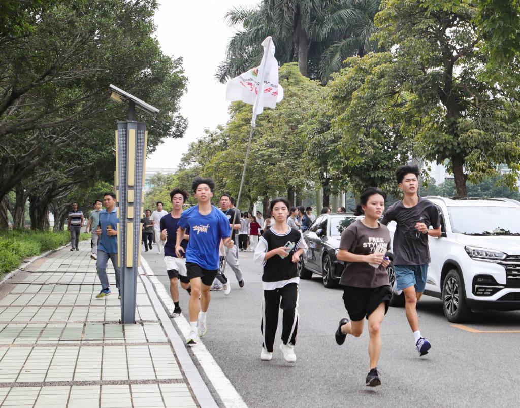随着一声鸣笛,师生们伴随着轻快的音乐、环着美丽的碧桂园湖跑动起来。长跑路线从梁銶琚礼堂前开始,环湖经过智慧门到图书馆,最后回到礼堂。一路上,师生们奔跑、欢呼,形成了跃动的环湖风景线。
