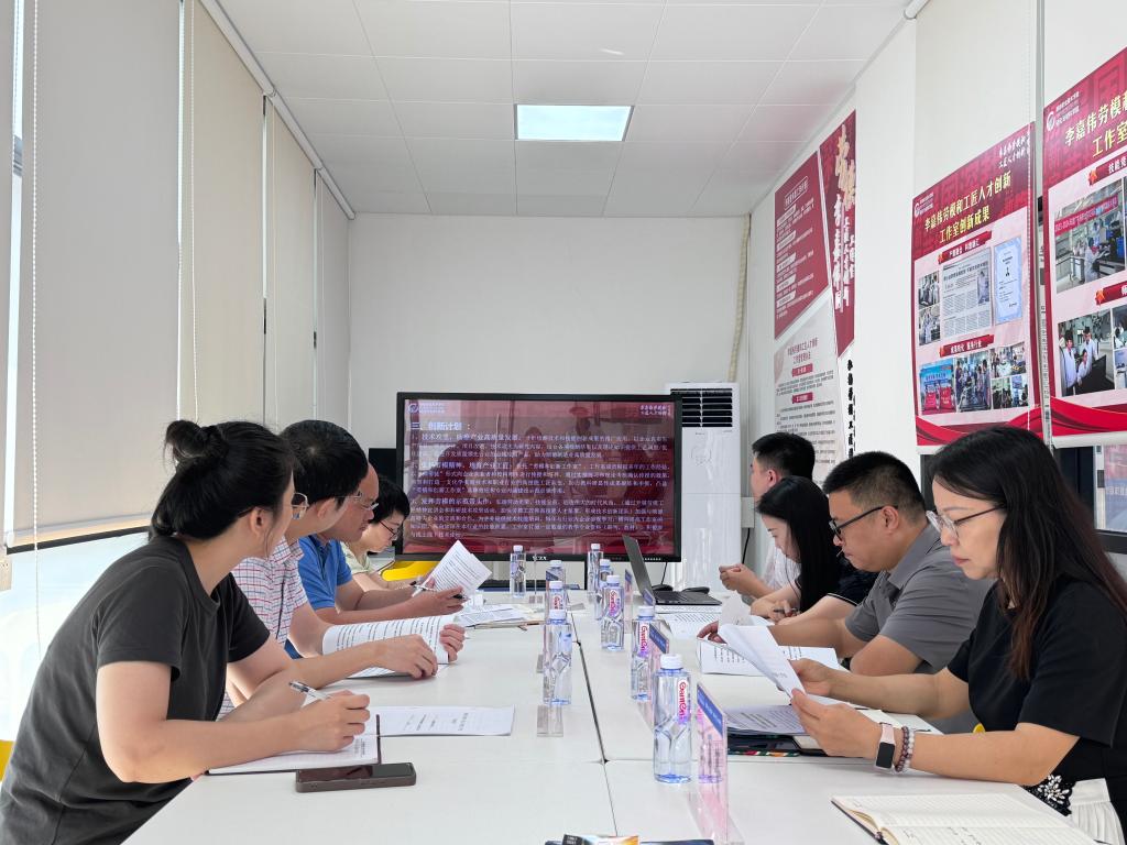 李嘉伟就工作室的建设进度进行了汇报,该工作室由16 名高技能、高学历人员组成,秉承“弘扬劳模工匠精神 传承技能育才报国”的工作理念,践行 “育训研用”的工作模式,服务区域、行业、企业,进行科研成果转化和社会服务,为顺德区建设高质量发展示范区贡献力量。