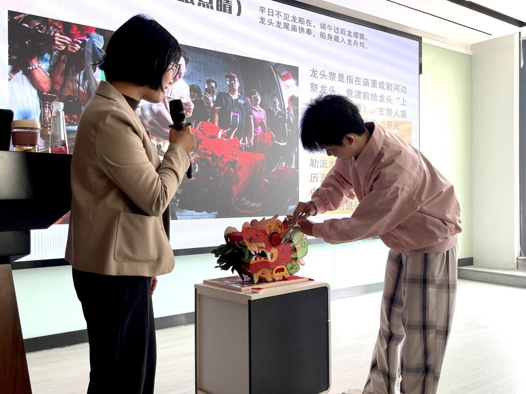 从口耳相传的龙形传说,到香火绵延的龙母诞辰;从劈波斩浪的龙舟竞渡,到灵动翻飞的彩带龙舞,直至声腔婉转的龙舟说唱——这五大龙文化载体,恰似五条水脉汇成顺德的精神长河。活动现场创新采用非遗拼图解码方式,配合视频、图片、实物,将非遗文化进行可视化呈现,让龙文化基因在青年学子的指尖生动流转。