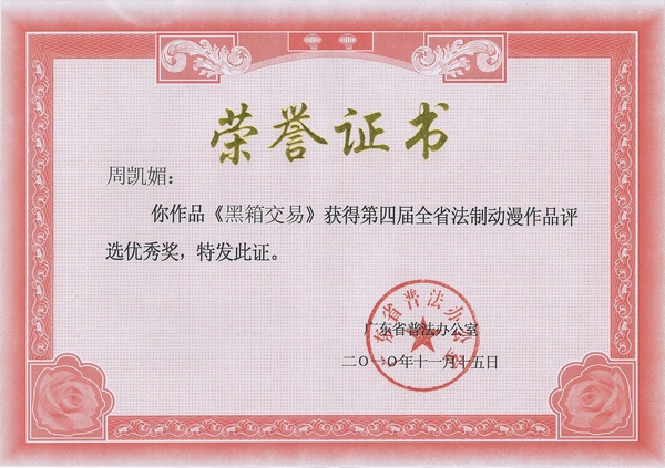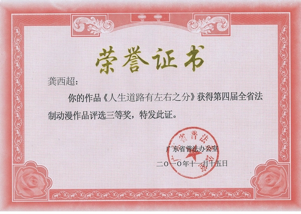 近日,广东省司法厅公布第四届广东省法制动漫作品征集评选结果,永利官网学生龚西超创作的作品《人生道路有左右之分》,荣获本次活动的三等奖;学生周凯媚、胡进成、苏秀捷创作的《黑箱交易》与学生罗颖创作的《黑妞升职记》,获得本次活动的优秀奖。