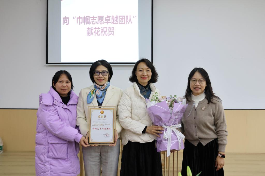 梁建茵代表学校工会向顺德区巾帼聚力“百千万工程”之巾帼志愿卓越团队——“顺德职院酒管学院师生巾帼志愿服务队”献花致贺。该团队在社会服务、公益活动中表现卓越,展现了学校女性师生无私奉献、勇担使命的精神风貌。