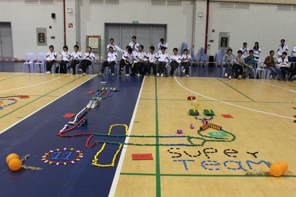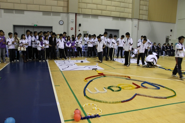 在总决赛前,学生处、电信系相关负责人,指导老师及全体辅导员都到现场进行指导,给了大赛莫大的支持和鼓励。在总决赛现场,气氛活跃,掌声不断,观众们都为参赛队员们的技能和创意欢呼呐喊。智能小车考验了学生单片机技术 和编程能力,多米诺骨牌则考验了学生的创意和团队精神。各参赛队的骨牌作品有科技节的吉祥物“小科”、振翅飞翔的蝴蝶、带着学生青春梦想的漂流瓶、跳跃音符及幸运星、承载学校校徽的奔驰、展示国家科技创新进步历程的“嫦娥二号”、上海世博会的“中国馆”等造型,充分发挥了学生技能展演、语言表达、团队展示等方面综合能力。