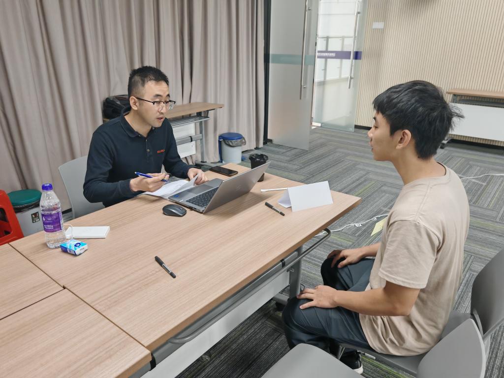 面试分上午9:00-12:00、下午13:30-17:30两个时段进行,采用“结构化面试+场景化实操+项目答辩”模式,重点考察学生的专业技能、项目实践经验、创新思维及职业素养。库卡机器人派出资深工程师与人力资源团队组成评审小组,对学生进行综合考核。在工业机器人技术专业考核环节,面试官针对库卡机器人编程调试、多机器人协同控制等产业实际问题展开提问,学生结合“美的工厂机器人分拣项目”“库卡虚拟仿真实训”等经历现场作答,展现出较强的工程实践能力。
