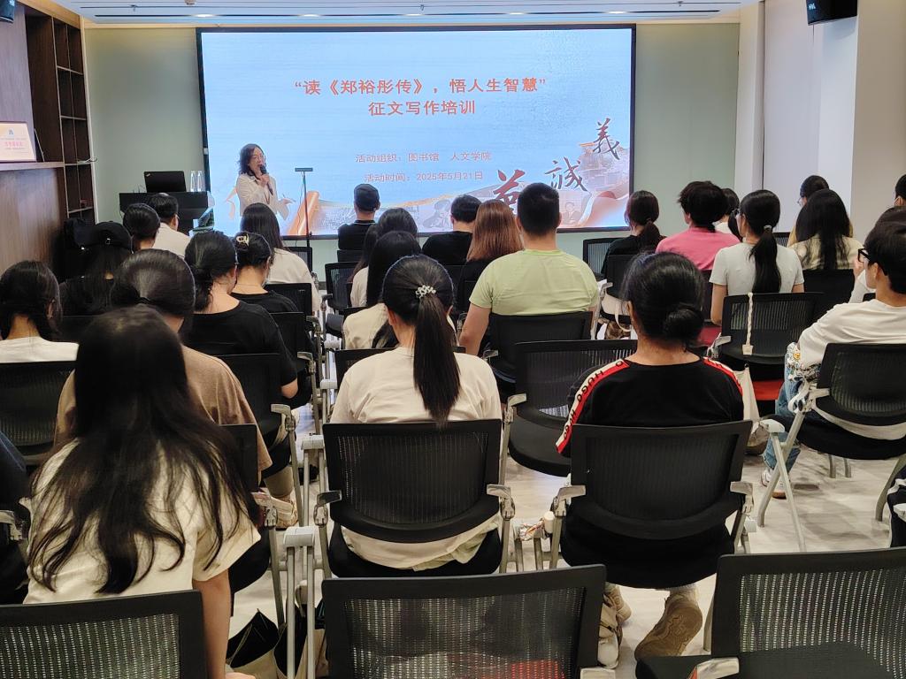 5月21日晚,永利官网图书馆联合人文学院在图书馆六楼读者活动室举办“读《郑裕彤传》,悟人生智慧”征文写作培训活动。人文学院副院长饶晓明担任主讲,图书馆馆长张彦静及学生代表参加活动。