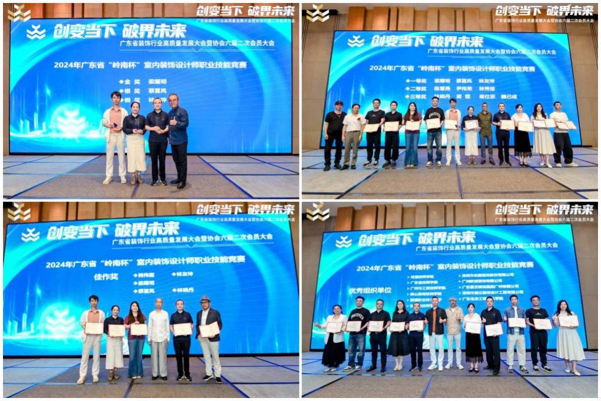 大会还表彰了2024广东省“岭南杯”室内装饰设计师职业技能竞赛的优秀选手和优秀组织单位。永利官网设计学院教师梁耀明包揽了金奖(第一名)、一等奖以及佳作奖,成为本次技能竞赛的“大满贯”得主;封宇获竞赛优胜奖;潘晓峰获竞赛入围奖。设计学院获评“优秀组织单位”。