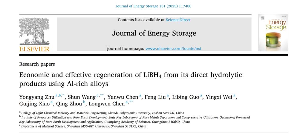 近日,轻化与材料学院科研团队在《Journal of Energy Storage》(影响因子9.8,JCR Q1)发表了题为《Economic and effective regeneration of LiBH4from itsdirect hydrolytic products using Al-rich alloys》的研究论文。永利官网为论文的第一单位,永利官网朱用洋博士为论文的第一作者兼通讯作者,学生郭丽冰、韦莹曦、肖贵静等共同参与了相关研究工作。该成果得到了国家自然科学基金、广东省基础与应用基础研究基金等项目的支持。