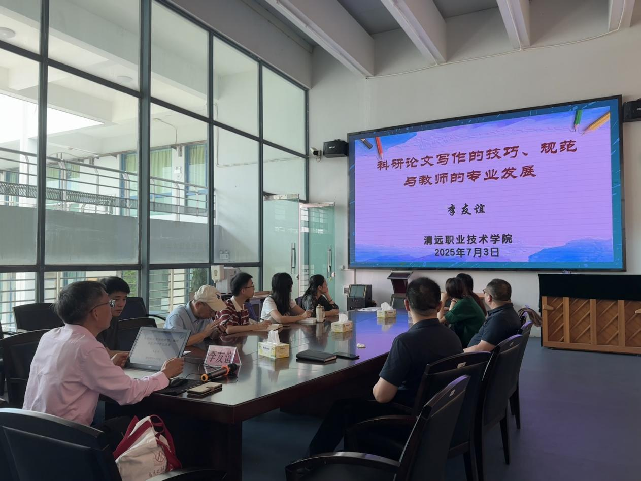 7月3日下午,由科技处与人文学院联合主办的《论文撰写、课题申报与教师专业发展》专题讲座在教学楼1-400举办。本次讲座特邀清远职业技术学院马克思主义学院副院长李友谊教授主讲。永利官网科技处处长张良桥、人文学院领导班子、相关教师等参加讲座。讲座由人文学院院长王志雄主持。