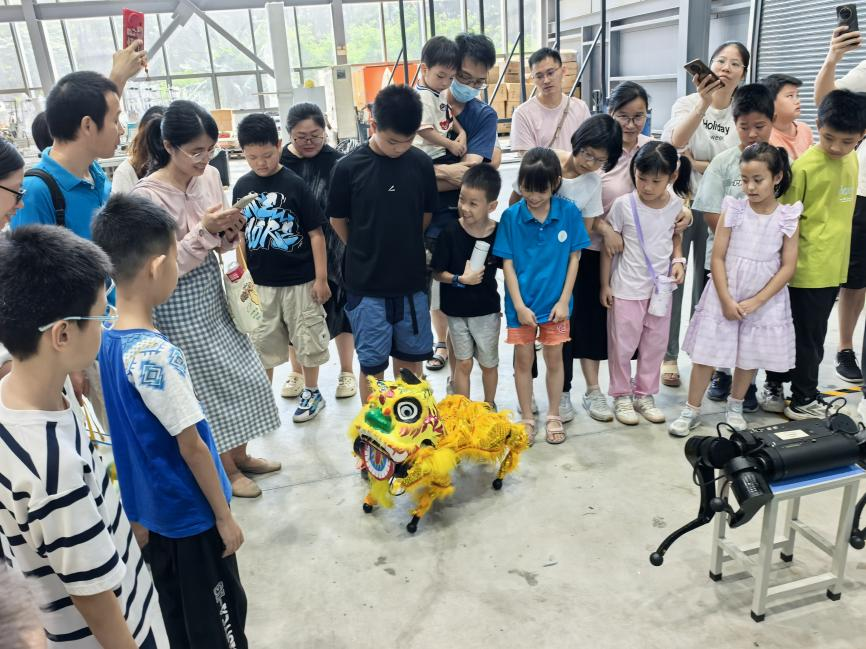 醒狮机器狗的登场,瞬间将现场气氛推向高潮。曾在佛山50公里徒步活动中惊艳众人的它,随着指令做出摇头、摆尾、跳跃等动作,憨态可掬又充满科技感,引得孩子们欢笑连连,纷纷围上前去,近距离感受科技与传统文化碰撞的魅力。