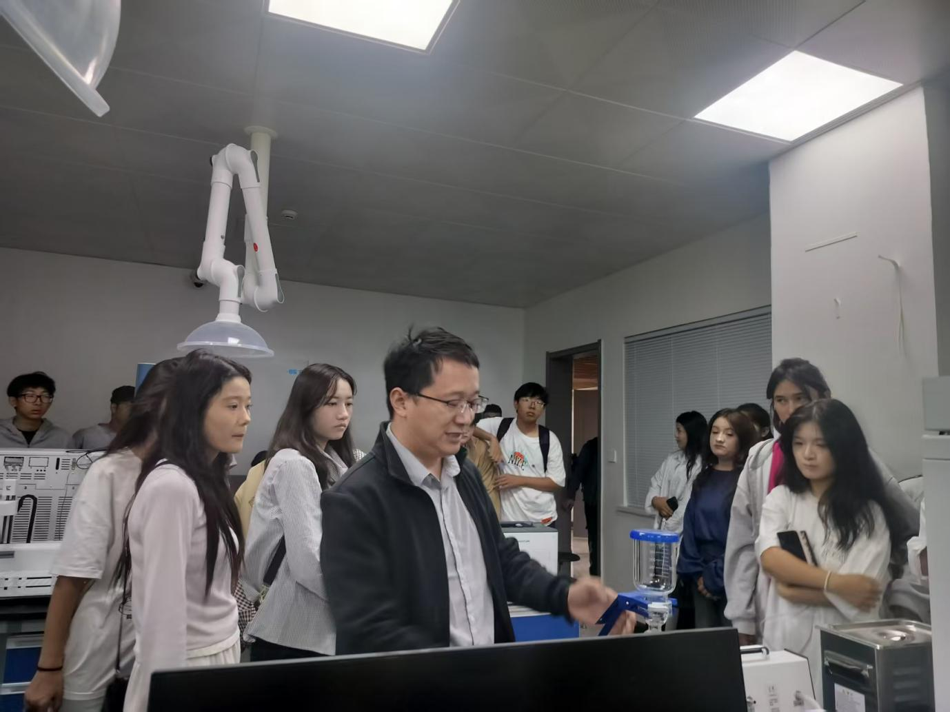 活动期间,老师们带领学生实地参观了食品理化实验室、精密仪器分析室和食品加工实验室。彭莺针对色谱、光谱、质谱等大型精密仪器,详细讲解其原理和安全注意事项,让学生们对这些精密仪器有了初步直观认识。唐秋实着重介绍了质构仪、凯氏定氮仪、索氏抽提仪等食品理化分析设备的工作原理、应用场景和安全事项。