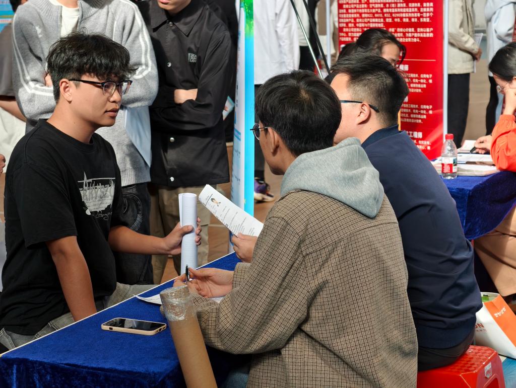 梁銶琚堂内人头攒动。毕业生手持简历,积极与招聘代表交流,了解岗位要求、发展空间和薪酬待遇。会场各企业展位前排起长队,招聘代表耐心解答疑问,介绍企业情况和岗位需求。