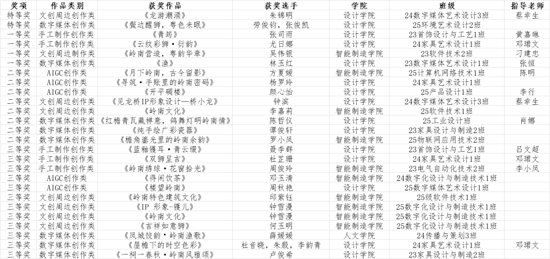 全校共有千余名师生参与本次比赛。经过一个月的精心筹备,主办方共收到百余份来自师生团队的作品,其中50份作品脱颖而出,成功入围决赛。作品涵盖了文创周边、数字媒体、手工制作、AIGC四大类别,具体细分为平面设计、摄影摄像、首饰设计、家具设计、空间展示、产品设计等多个领域。经过组委会和专业教师的严格评选,最终评出特等奖2项、一等奖4项、二等奖8项、三等奖12项。