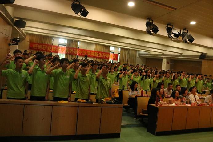 随后,各班班主任、辅导员代表分别发言,为新生开学送上寄语,期待新生们拥有美好的未来。紧接着,三位高年级优秀学长代表上台演讲,与新生分享自身的学习经验,鼓励新同学树立目标、抓住机会,为实现人生的目标而努力奋斗,他们流利的英文,诙谐的表达引来现场阵阵掌声。随后,全体新生在19级新生代表宁谦的带领下进行了庄严的入学宣誓。
