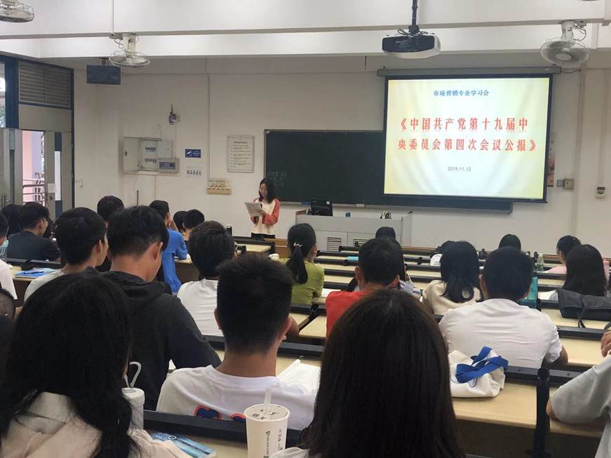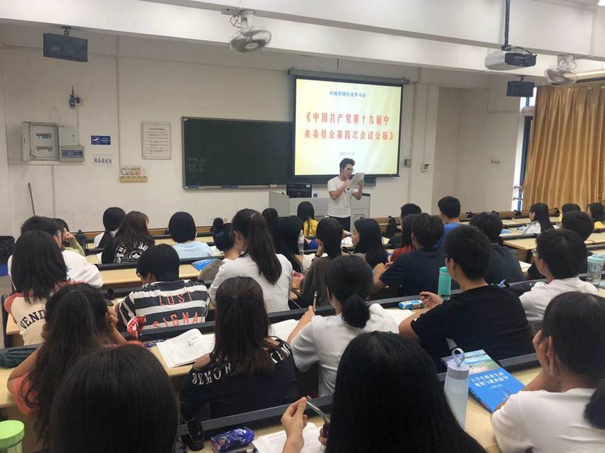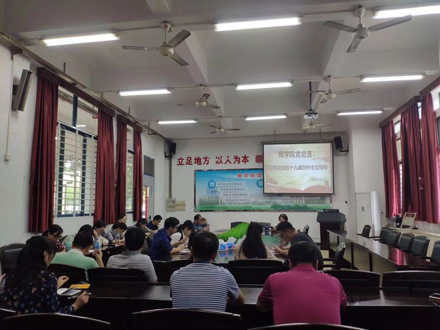 为学习贯彻党的十九届四中全会精神,商学院党总支组织全体师生学习党的十九届四中全会会议公报。11月12日,学生以班级为单位,由团支书带头学习会议公报内容。11月13日,教工由党总支书记带头学习会议公报内容。