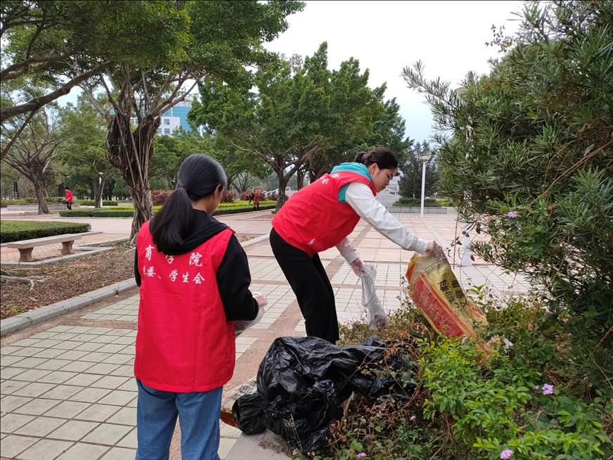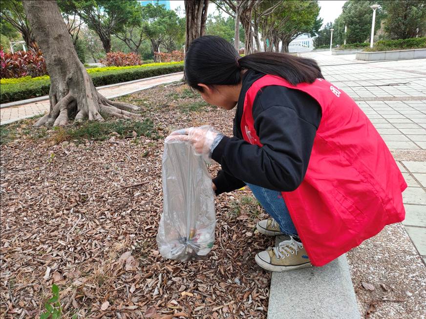 志愿者们首先协助后勤工作人员清洁校园,志愿者们积极主动清扫每一片落叶,有些扫把清理不了的,就用手把落叶清理出来。校园整洁的环境需要大家共同维护。