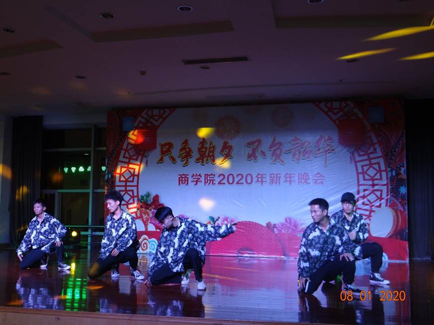 晚会以高钧院长致新年祝词拉开帷幕,商学院各党支部及专业教研室精心组织表演节目为大家送上新年祝福。财经党支部深情由专业带头人领唱《我和我的祖国》;党政办支部以爱国诗歌朗诵《祖国,一首唱不完的恋歌》和“佳人才子”扮相为大家送上轻松诙谐同时饱含新年祝福的“三句半”曲艺表演;实训室及平台课党支部以“反串”串烧歌舞表演《喜庆》让在教职工笑开了花;电商及营销党支部带来古诗朗诵《梦游天姥吟留别》展现出文人雅风;企管党支部为大家献上歌舞《阳光总在风雨后》鼓励大家继续勇往直前!晚会上,商学院学生党支部及学院艺术团更为大家带来了街舞表演、模特秀等精彩节目,晚会现场笑声不停、掌声不断,充满着欢乐祥和的气氛。