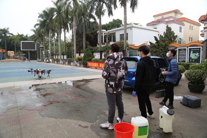 19工业分析1班彭俊生同学操作无人机开展社区消毒工作